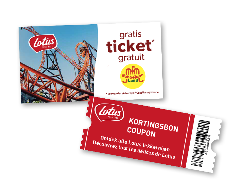 Naast al dat lekkers, zorgen we ervoor dat jullie in elk pakketje ook een ticket voor Bobbejaanland* en een Lotus kortingsbon kunnen stoppen (*geldig voor 1 persoon vergezeld van 1 betalende).